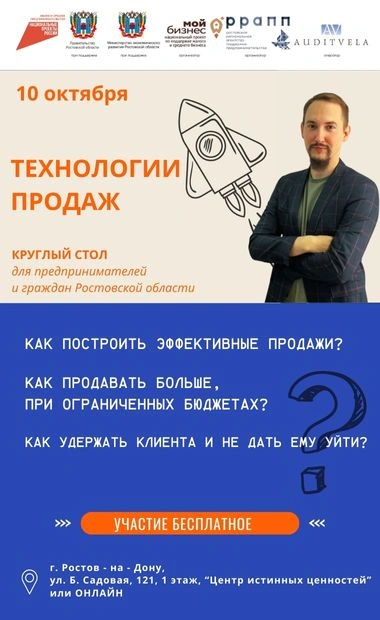 10 октября 2023 г. в Ростове-на-Дону состоится круглый стол для МСП и всех жителей Ростовской области, планирующих открыть свой бизнес, - «Технологии продаж».