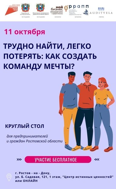 Участие в круглом столе бесплатное благодаря национальному проекту «Малое и среднее предпринимательство и поддержка индивидуальной предпринимательской инициативы» Адрес: г. Ростов-на-Дону, ул. Б. Садовая 121, 1 этаж, «Центр Истинных Ценностей». Также возможно онлайн-участие.