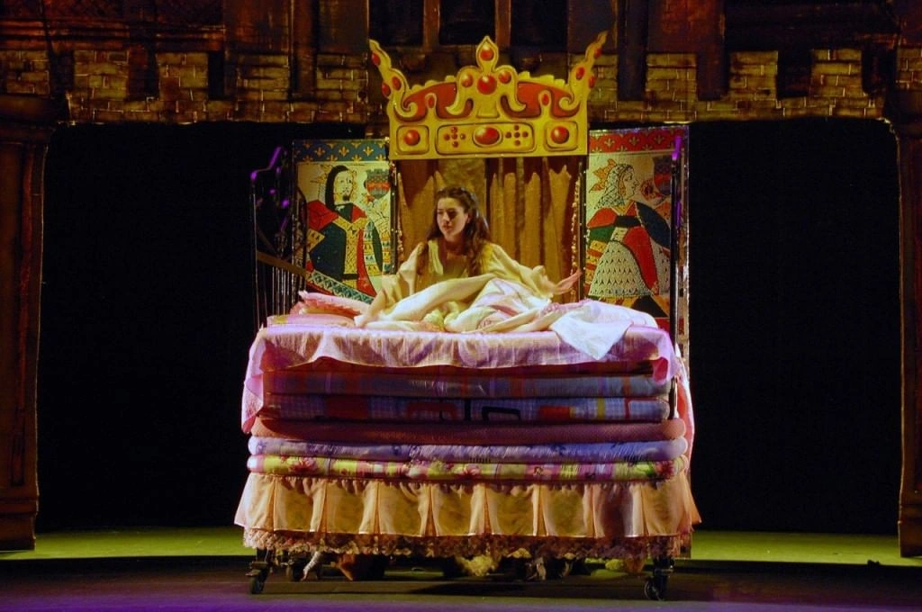Пространство спектакля – настоящий волшебный мир из цветных перин, расцвеченный сказочным светом, в котором живут веселые, яркие герои. Персонажи вызывают симпатию с первых минут – до того они милые, смешные и узнаваемые: властная Королева-мама, тихоня Король, энергичная Бабушка, романтичный Принц и отважная Принцесса.