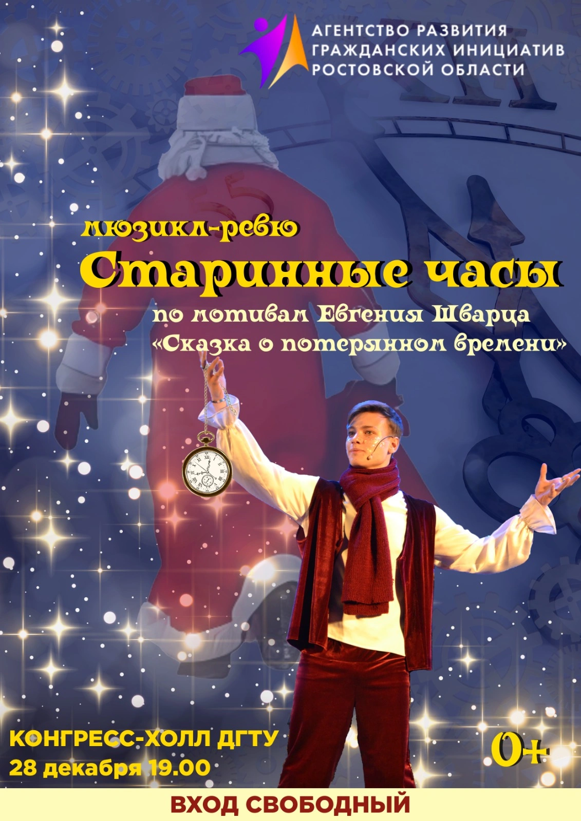 28 декабря в 19:00 в конгресс-холле Донского государственного технического университета, в рамках показа новогоднего мюзикла-ревю по мотивам Евгения Шварца "Сказка о потерянном времени" «Старинные часы», Благотворительный фонд «Имена», театр-студия «Браво-ДГТУ» совместно с ДГТУ проводит благотворительную акцию «Новогодняя елочка для всех».