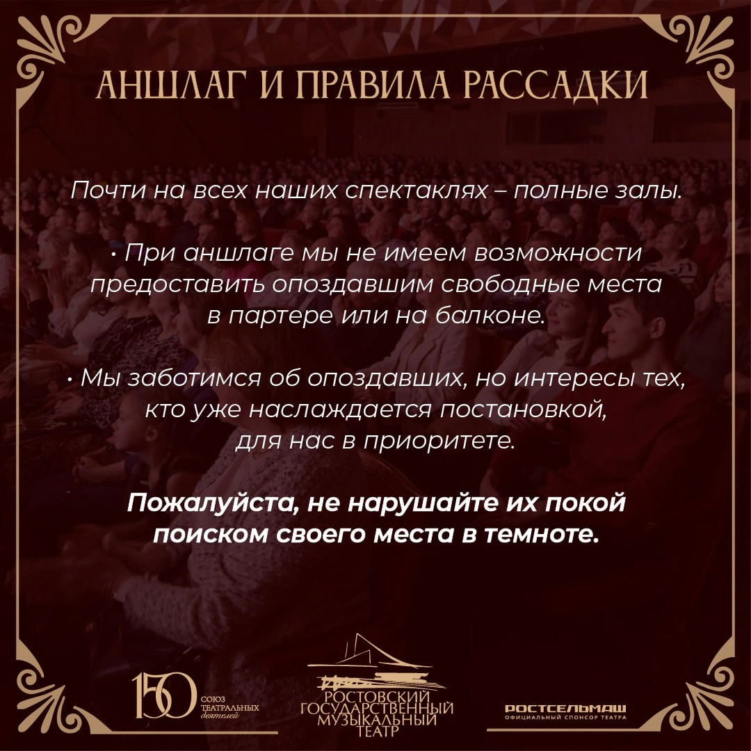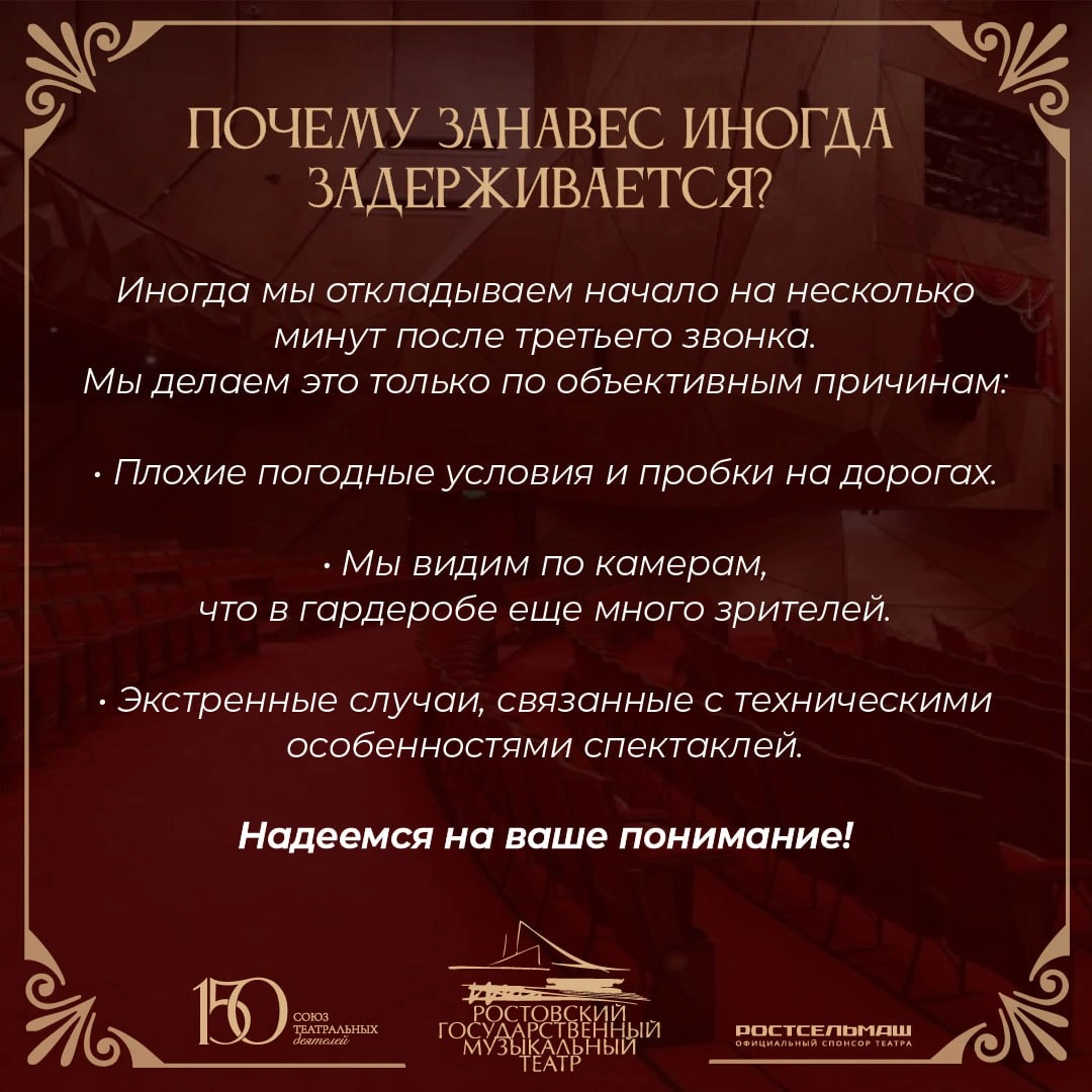 Как сообщили в Ростовском государственном музыкальном театре, данная мера предпринята для того, чтобы сохранить уникальную атмосферу при просмотре постановок.