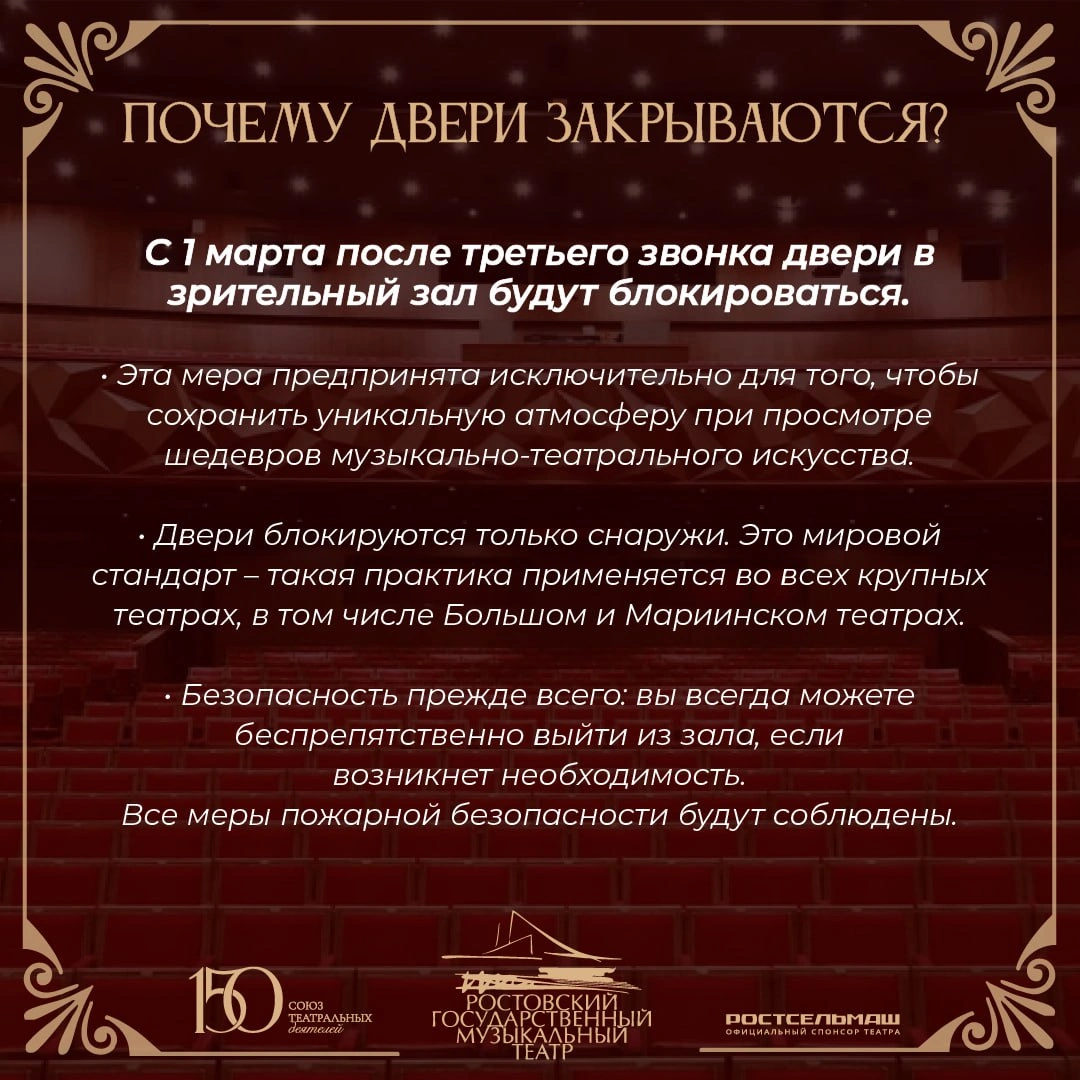 «Двери блокируются только снаружи. Это мировой стандарт – такая практика применяется во всех крупных театрах, в том числе Большом и Мариинском театрах. Мы заботимся об опоздавших, но интересы тех, кто уже наслаждается постановкой, для нас в приоритете. Коллектив театра очень внимательно относится ко всем вашим замечаниям и пожеланиям. Мы всегда стремимся к тому, чтобы ваше посещение театра было максимально комфортным и безопасным.», – пояснили в Ростовском музтеатре.