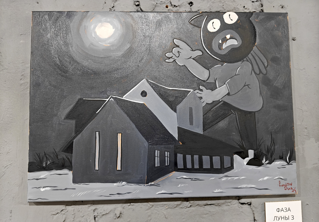 Страхи могут сформироваться везде. Пугающий образ способен появиться и на улице, и в лесу, и в привычной обстановке, говорят произведения Fatality Duck. Даже Луна иногда становится причиной детских переживаний. Три её фазы изображены по-разному. Например, когда месяц ещё молодой, за пределами дома более спокойно. А на картине с полнолунием изображён большой и встревоженный монстр.