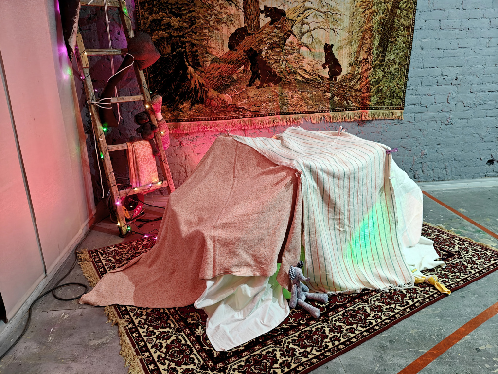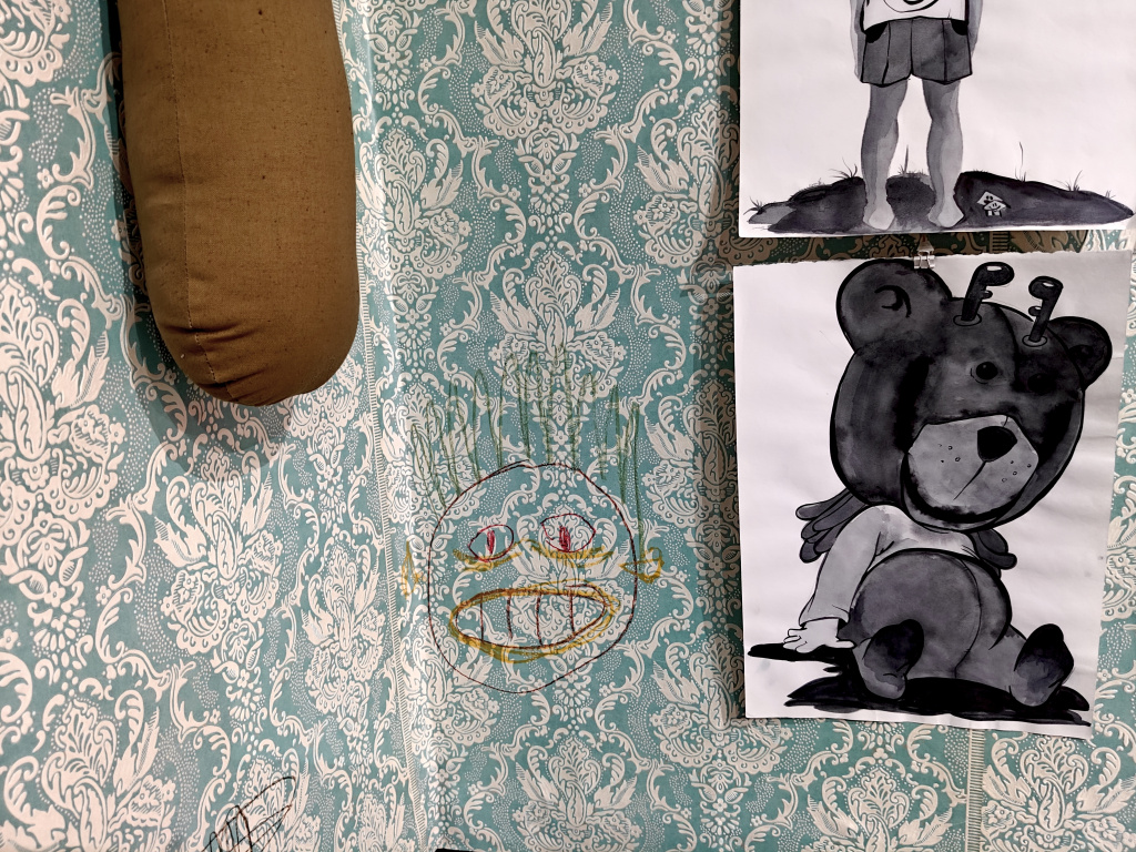 Зона семейных конфликтов плавно переходит в тему «Сны и ночные кошмары». Она представляет собой стену детской комнаты, разрисованную разноцветными карандашами. Здесь можно увидеть серию вышивок, каждая из которых расскажет, какое пугающее существо может прийти в голову ребёнка. Так, на дереве сидит монстр с рогами и острыми зубами. Ещё один держит в руках опасный предмет. Глаза другого излучают свет, как фонари. На стену прикреплены и «детские» рисунки страшных существ. Однако малыши пытаются бороться с ними, как могут. В этой зоне висят самодельные предметы защиты и экипировки. Они мягкие и безопасные, но в детском воображении превращаются в самое настоящее оружие против страхов.