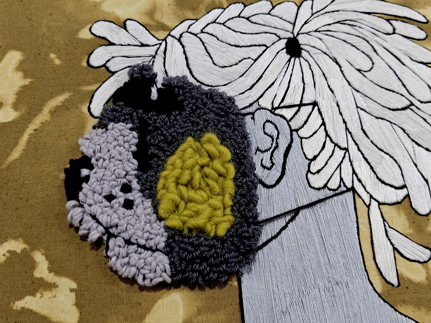 Она разделена на четыре зоны. Первая — «Корни страха» — расскажет о том, что может стать причиной формирования переживаний. Сначала посетителей встречают «Череп», «Кот» и «Бабка». Работы вышиты гладью и ковровой иглой. Пожилая женщина на холсте улыбается, она одета в косынку и кофту с миниатюрными цветами, но, несмотря на дружелюбный вид, выглядит жутко.