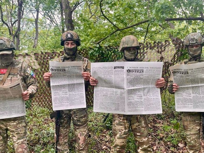 Фото: На позиции солдат доставлен репринт газеты от 9 мая 1945 года
