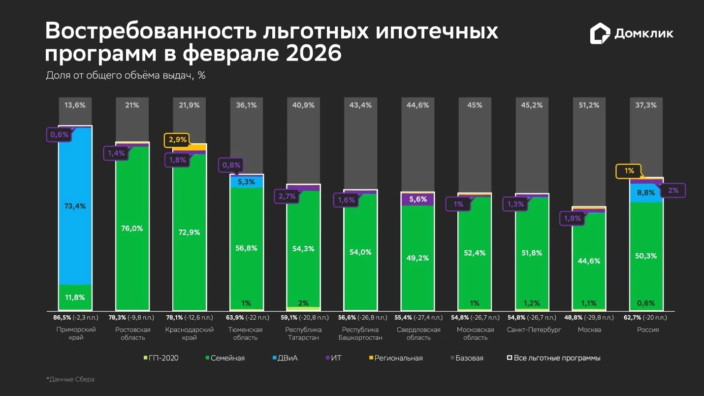 По итогам февраля 2026 года Сбер выдал ипотечные кредиты на общую сумму 209,7 млрд рублей, что на 72,3% превышает показатели февраля 2025 года. Доля рыночной ипотеки составила 37,3%, что на 20 процентных пунктов выше январских значений. Увеличение спроса на базовые программы оказало прямое влияние на структуру спроса по типам жилья: доля вторичного рынка достигла 29,5%, увеличившись на 16,3 процентных пункта по сравнению с январем и обновив максимум с марта 2024 года.