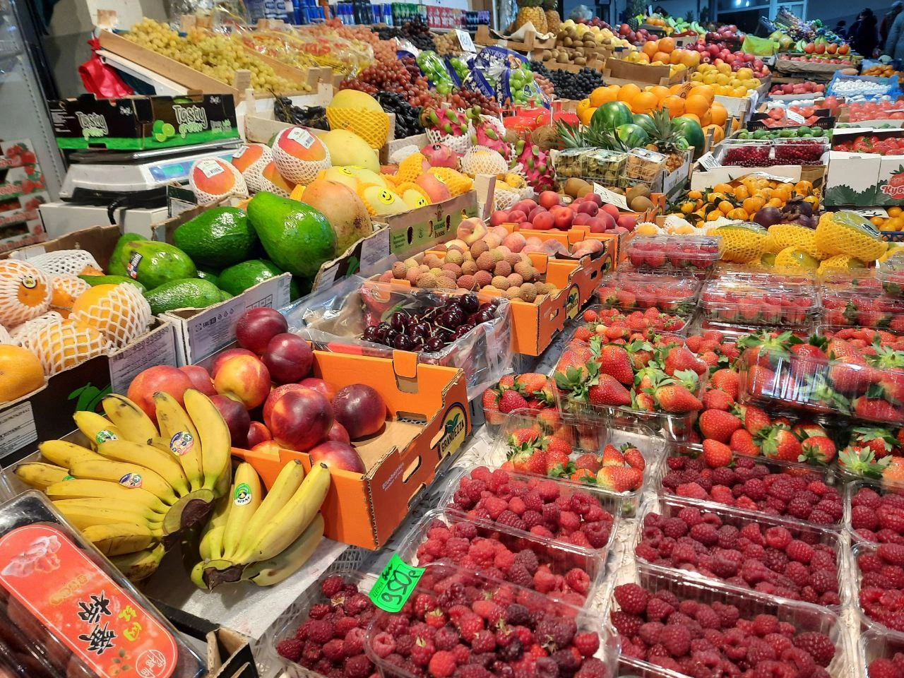 На рынке большой выбор привычных фруктов и ягод – клубника, бананы, мандарины, апельсины, ананасы, малина и др.