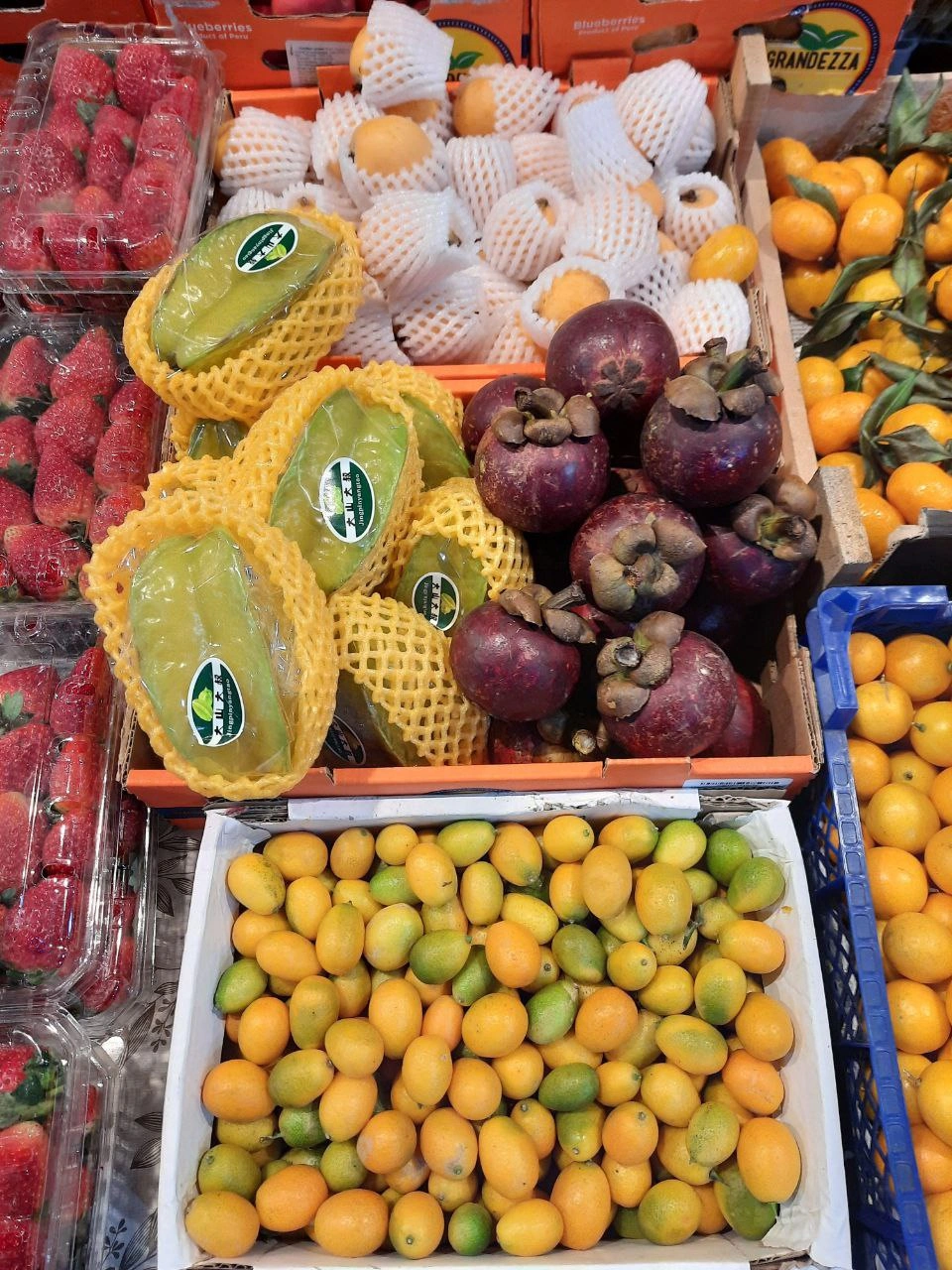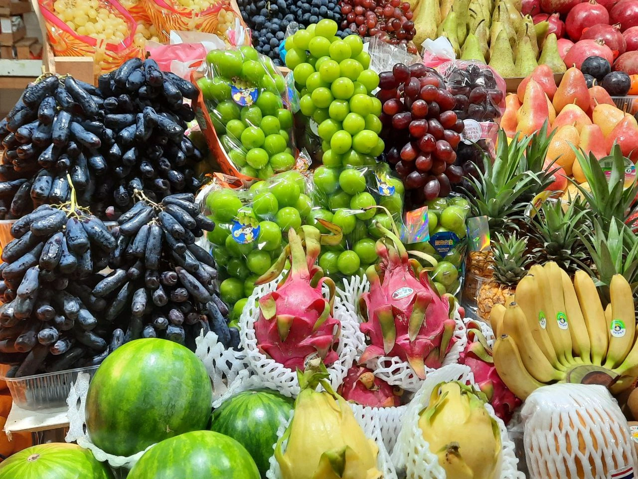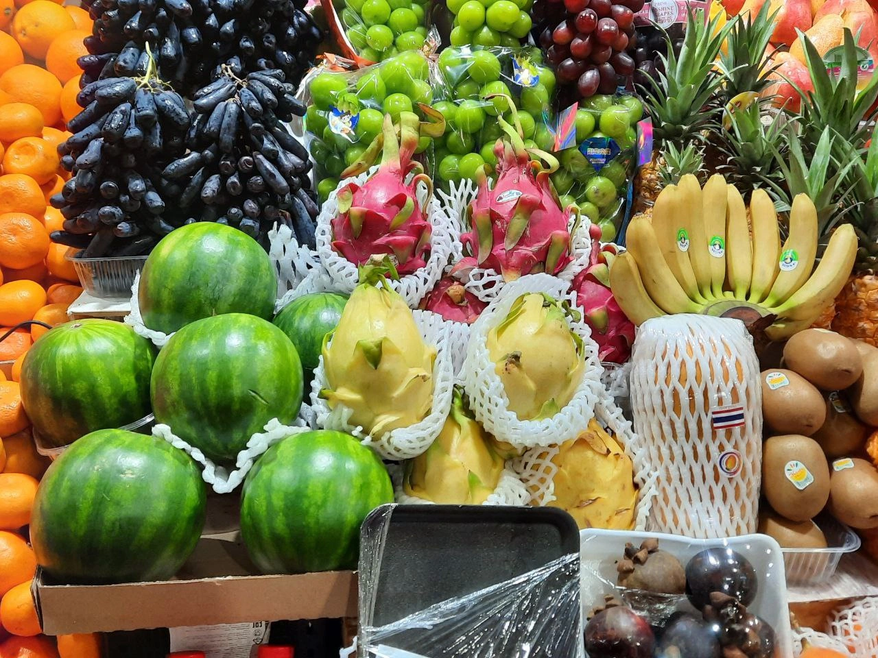 А вот ассортимент мест №90, 97, 98 может удивить. Здесь и манго, и два вида питахайи, и карамбола, и популярный азиатский виноград, и личи, и миниатюрные бразильские арбузы и многое другое.