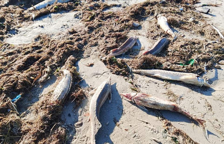 На днях местные жители, пришедшие на берег возле аквапарка «Лазурный», обнаружили на прибрежной полосе в районе улицы Адмирала Крюйса десятки мёртвых молодых осетров длиной 40–50 см.
