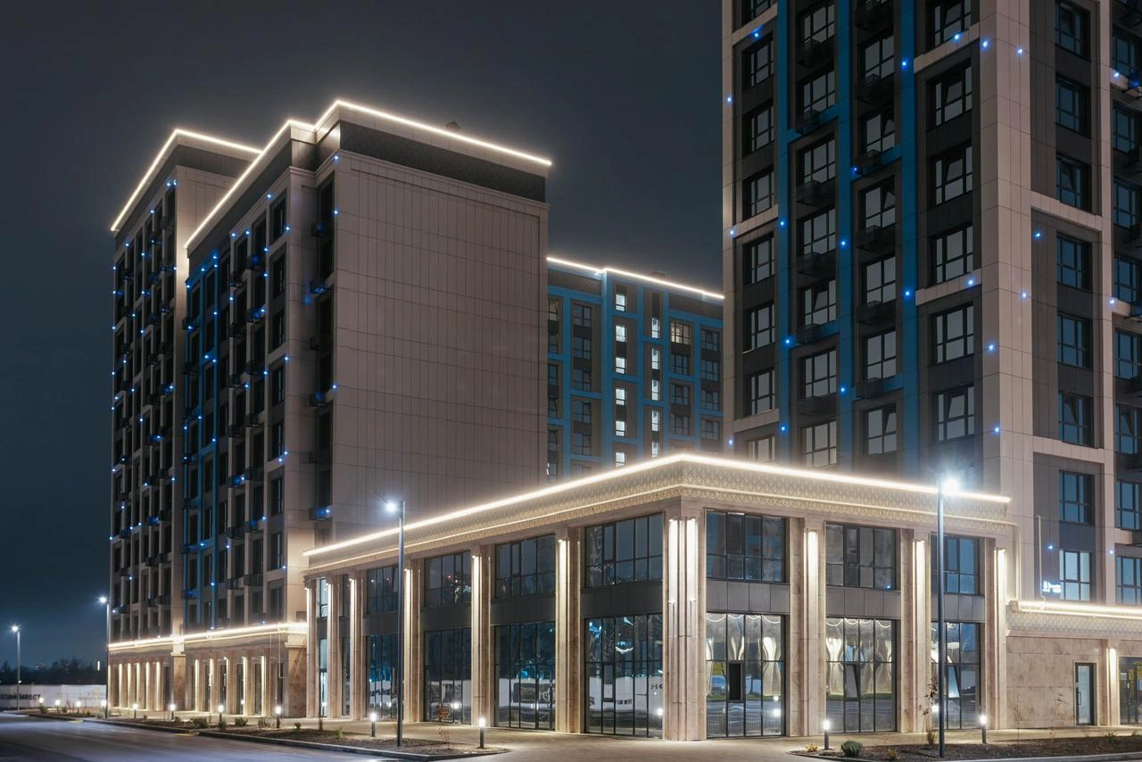 Архитектурное оформление фасадов жилых домов выполнено в светло-голубой цветовой гамме, дополнено декоративным орнаментом и контрастными акцентами. Эстетический облик зданий подчеркивается эффектной концептуальной подсветкой, создающей уникальную атмосферу в вечернее время.