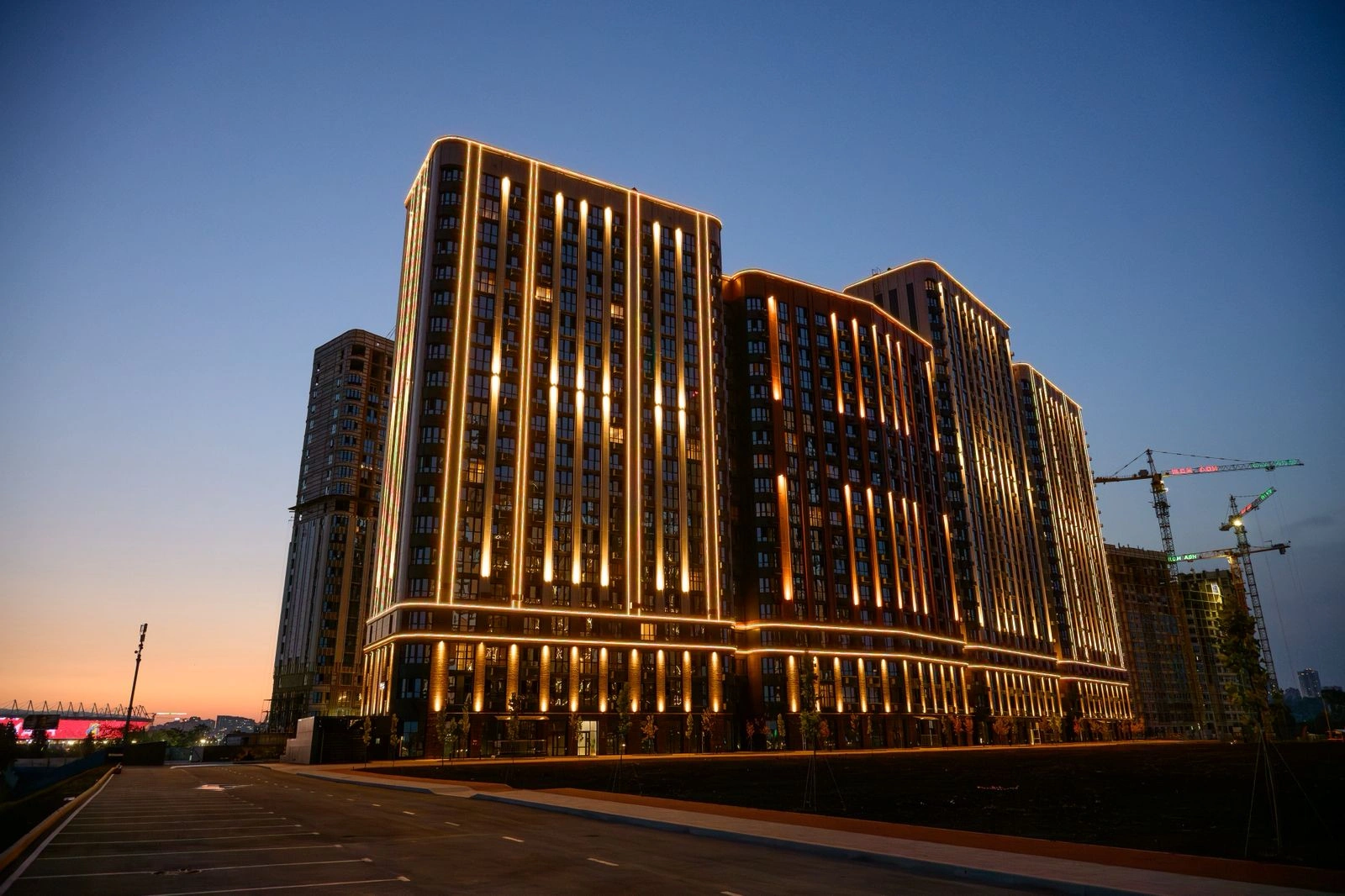 Литер 9 стал следующим этапом проекта. Он представляет собой дом переменной этажности — от 19 до 25 этажей — с просторными квартирами, элегантными холлами и выразительными фасадами с ночной подсветкой.
