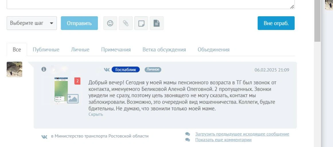 «У моей мамы пенсионного возраста в ТГ был звонок от контакта, именуемого Беликовой Алёной Олеговной. Два пропущенных. Звонки увидели не сразу, поэтому цель звонящего не могу сказать, контакт мы заблокировали. Возможно, это очередной вид мошенничества. Коллеги, будьте бдительны. Не думаю, что звонили только моей маме», - написала женщина.