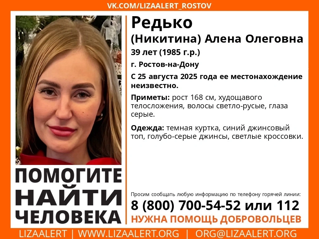 По информации полиции, женщина уехала из дома в Аксае на автомобиле со своим бывшим мужем. Мужчина сообщил, что видел ее в последний раз около 21:30 в районе пересечения улиц Ульяновской и Семашко в Ростове-на-Дону, где он ее высадил. После этого связь с Алёной прервалась.