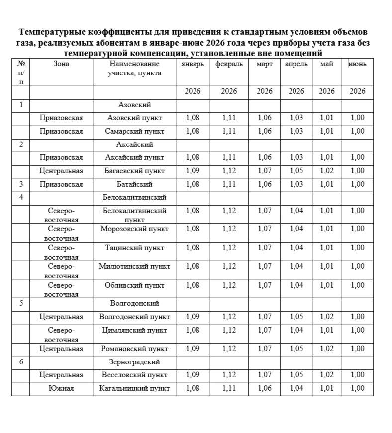 В Ростовской области с 1 января 2026 года изменятся температурные коэффициенты, которые будут использоваться для расчета объема газа в Ростовской области с января по июнь 2026 года. Они помогут корректировать показания счетчиков газа, чтобы они соответствовали стандартным условиям, даже если счетчики не учитывают изменения температуры.