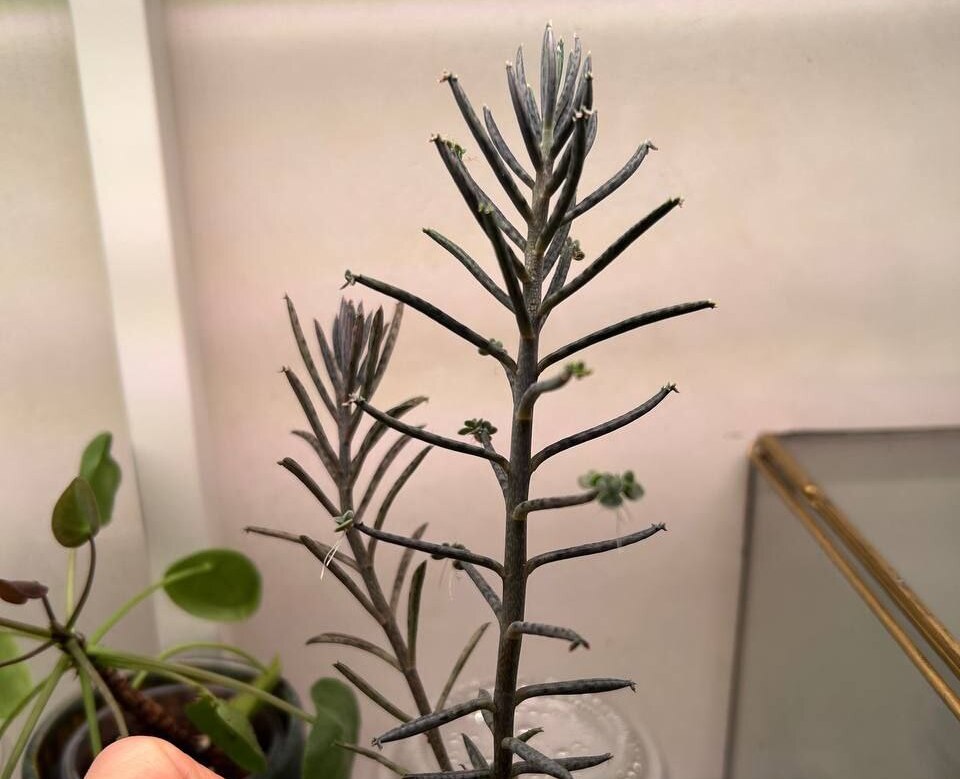 Ещё один каланхоэ, который больше напоминает инопланетное растение, — трубкоцветное. Он представляет собой тонкий стебель, на котором расположены веточки-листья. Также станет прекрасным дополнением коллекции для любителей экзотики.