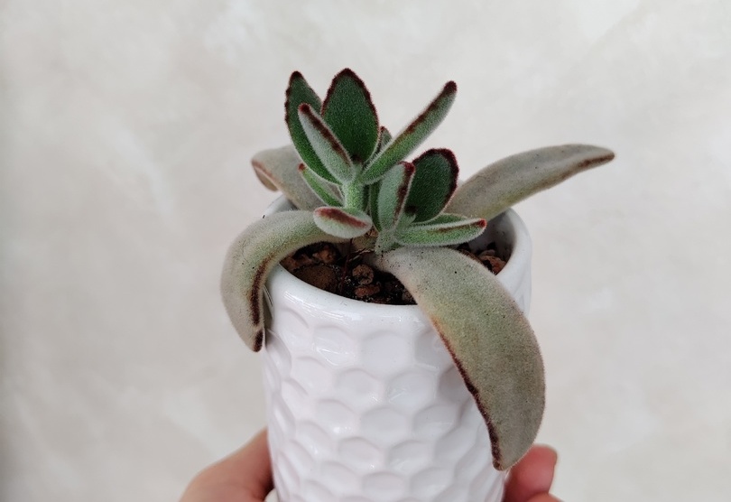 Каланхоэ войлочное покорило сердца пушистых растений. Его листья полностью покрыты волосками, а кончики окрашены в коричнево-бордовый оттенок. Цветение менее декоративно.