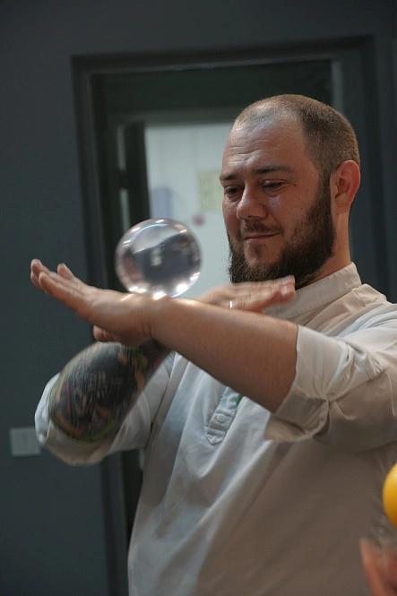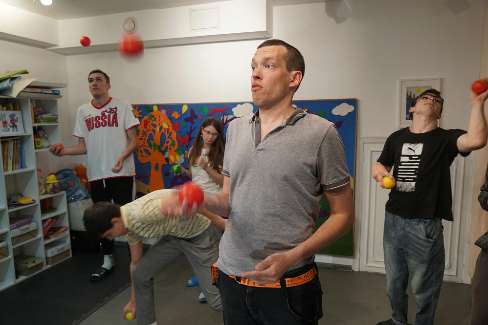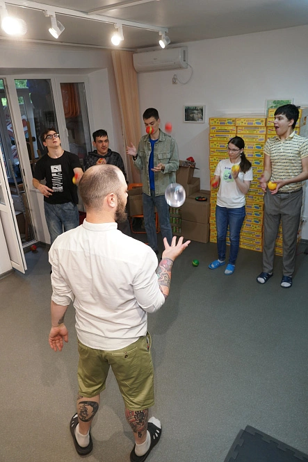 Два раза в неделю в «Надежде» проходят мастер-классы по жонглированию и изучению трюков. Фокусник-иллюзионист Илья Данчев учит подопечных не бояться публики и концентрироваться на новых умениях.