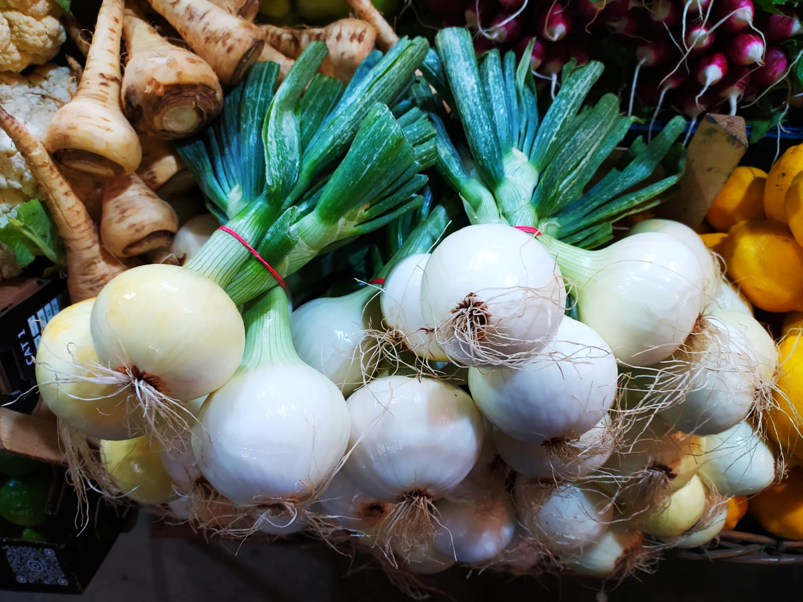Далее следует порезать репчатый лук. Прошлогодний продаётся от 50 рублей за килограмм. На Северном рынке можно найти уже и молодой, пучок из крупных клубней оценивается в 150 рублей. Также в продаже есть всевозможные другие виды: красный по 200 рублей за кило, ялтинский по 350.