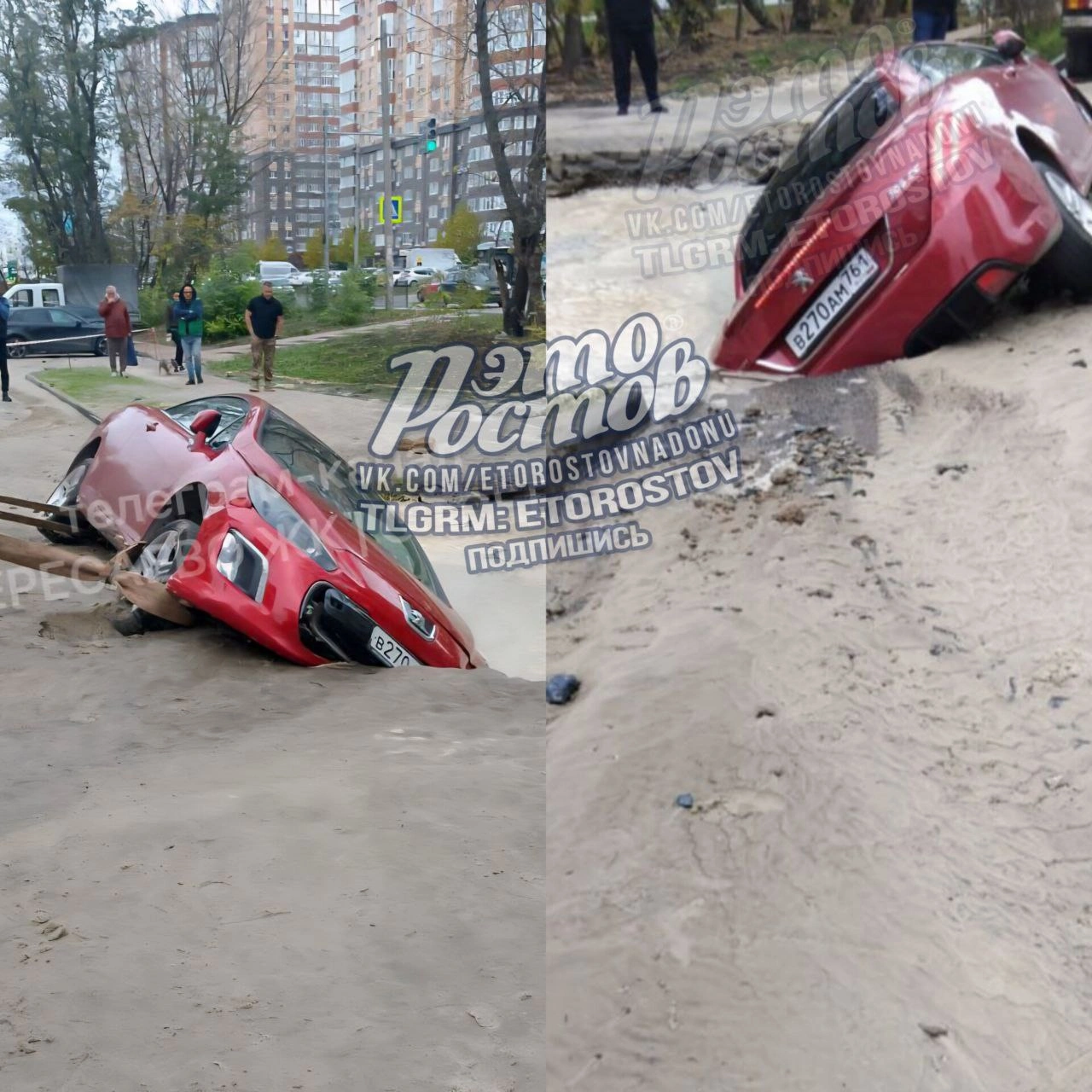 В результате образовавшегося подмыва почвы легковой автомобиль марки «Пежо» провалился под землю. В настоящее время ведутся поиски владельца транспортного средства для выяснения всех обстоятельств произошедшего.