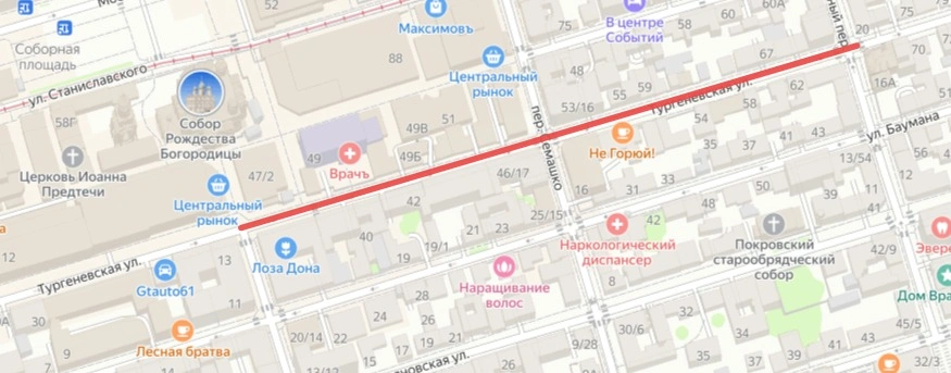 — ул. Тургеневская от пер. Соборный до пер. Газетного по нечетной стороне улицы.