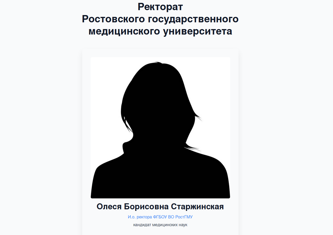 Что касается Олеси Старжинской, то официальных сообщений на сайте РостГМУ нет, зато в строке «Ректорат» вместо Сергея Шлыка появилась своеобразная фотография с подписью «и.о. ректора Олеся Борисовна Старжинская».