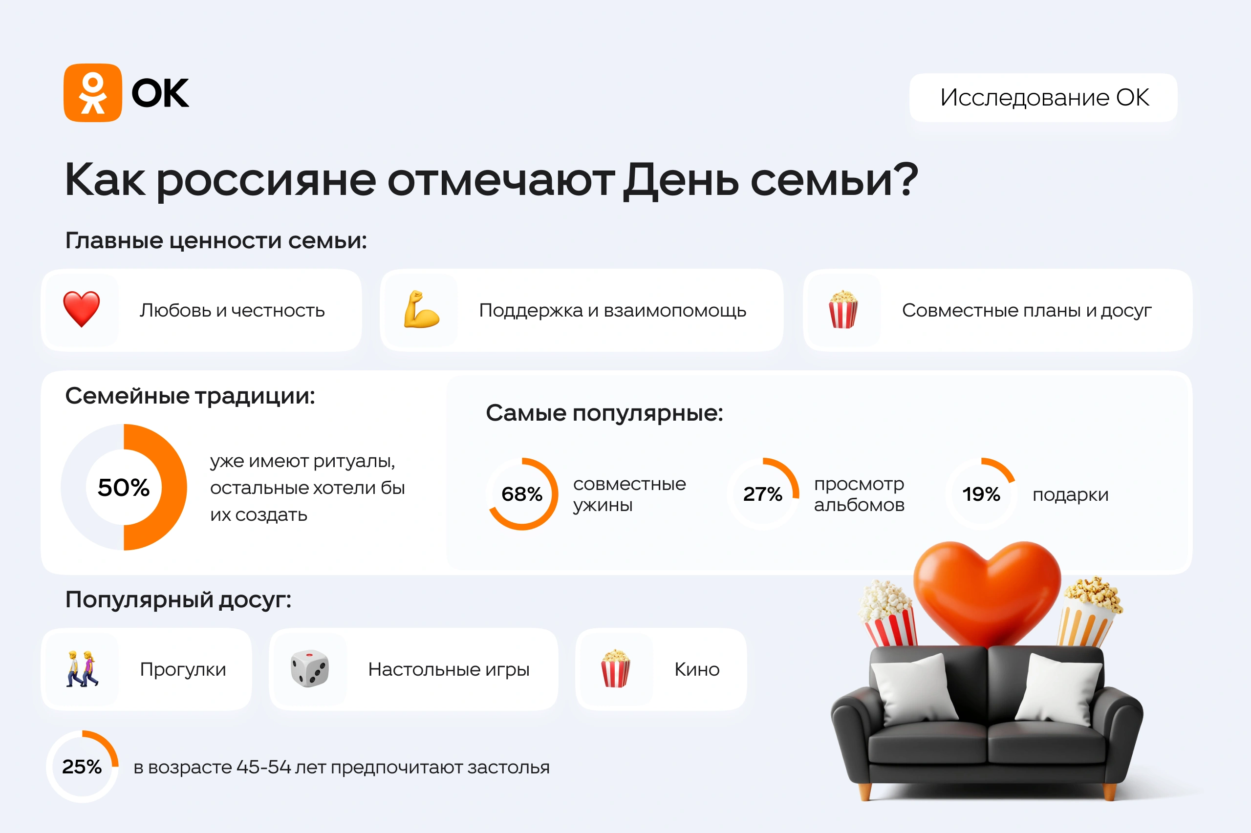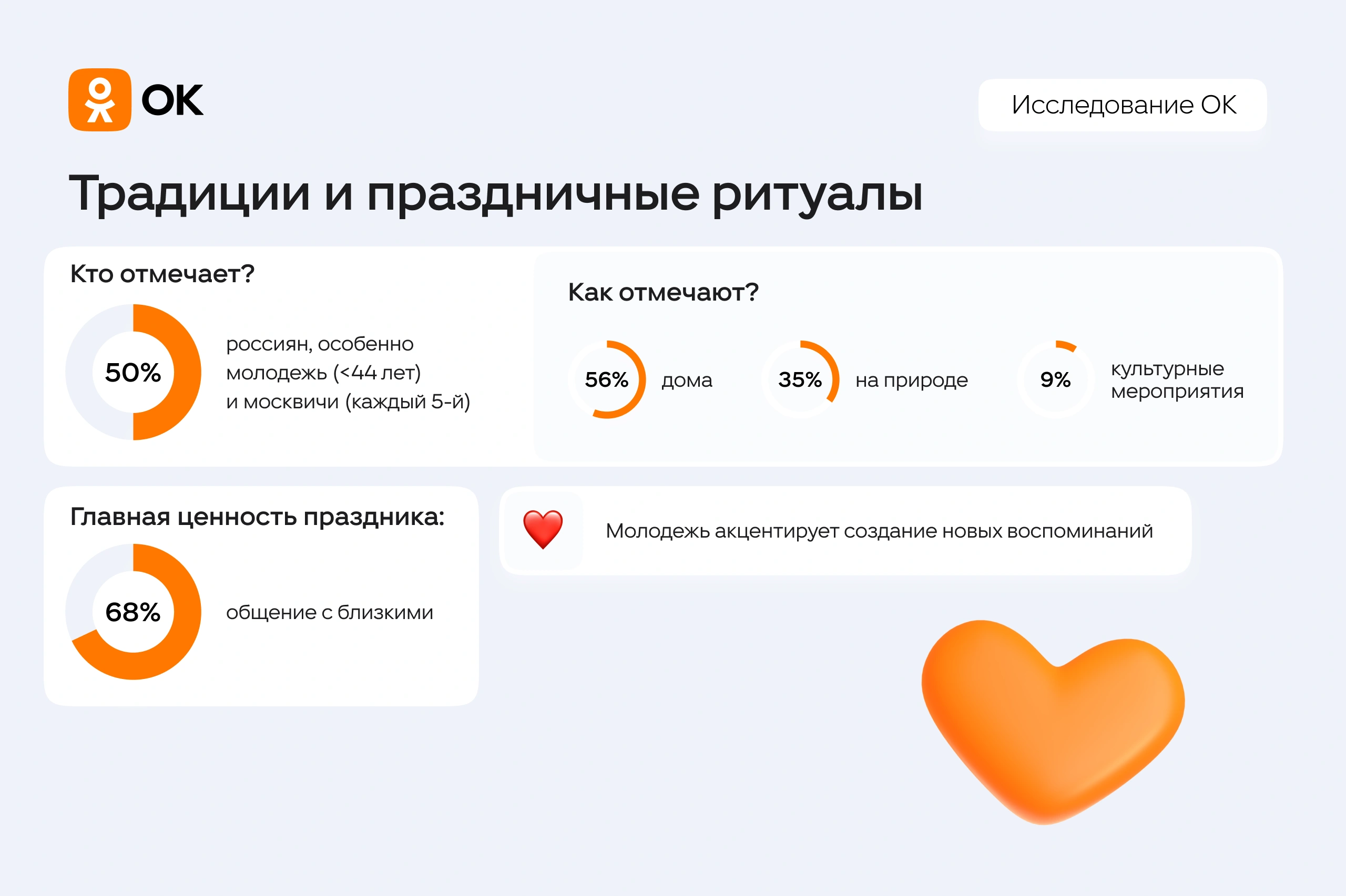 Для 68% участников главное в Дне семьи — это общение с близкими. А молодежь до 44 лет больше внимания уделяет созданию новых семейных воспоминаний.
