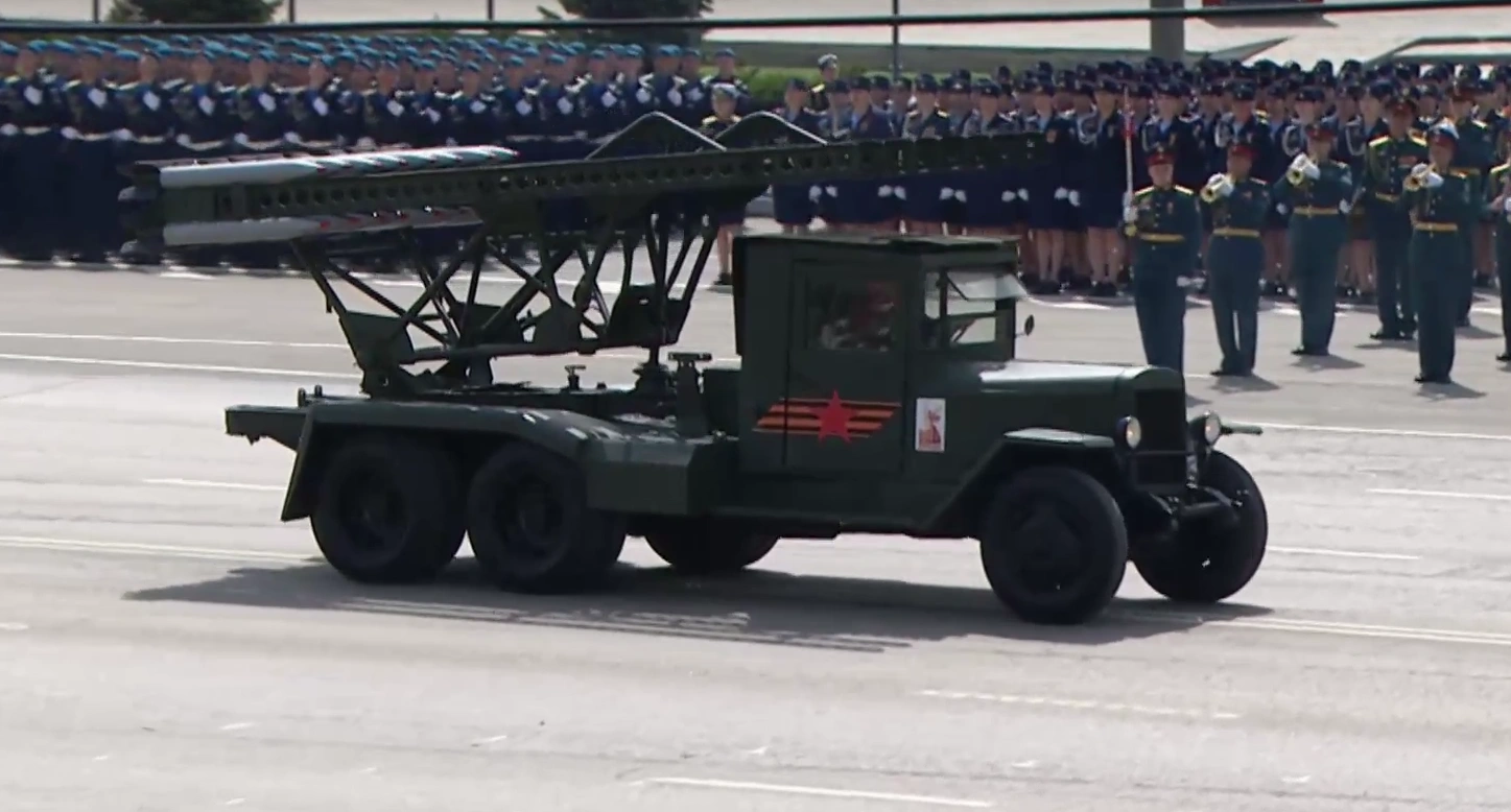 Первым на Театральную площадь выехал танк Т-34 - один из символов Великой Победы. Вслед за ним по площади проехала не менее легендарная "Катюша".
