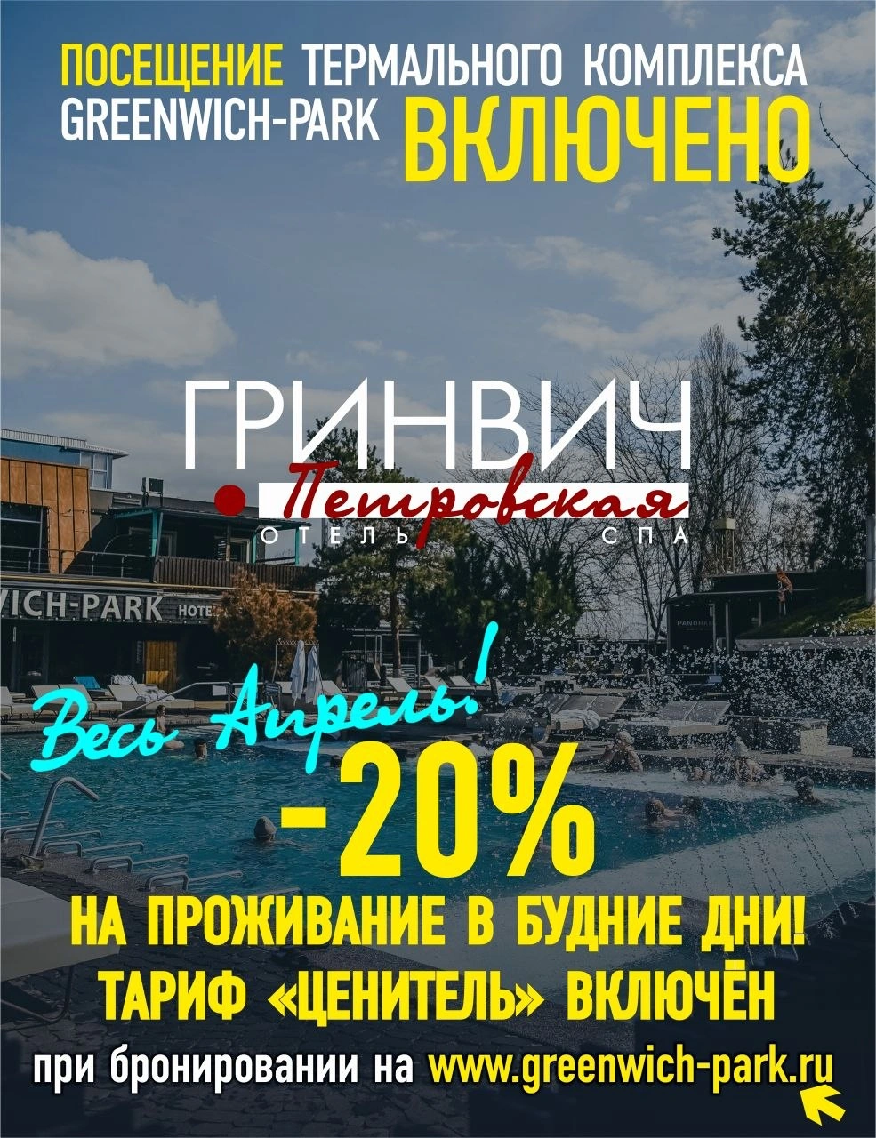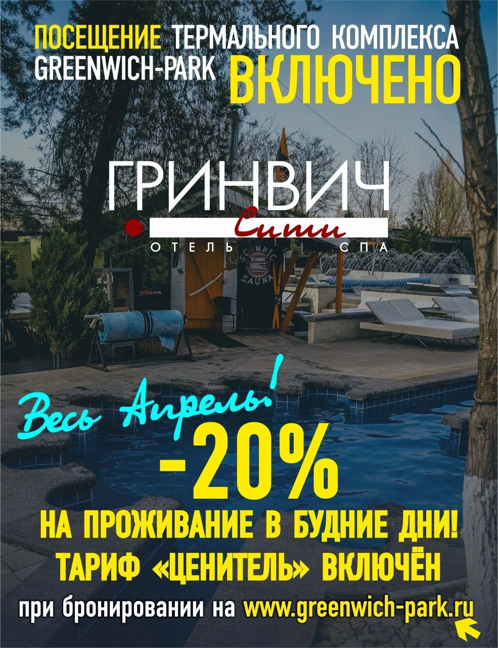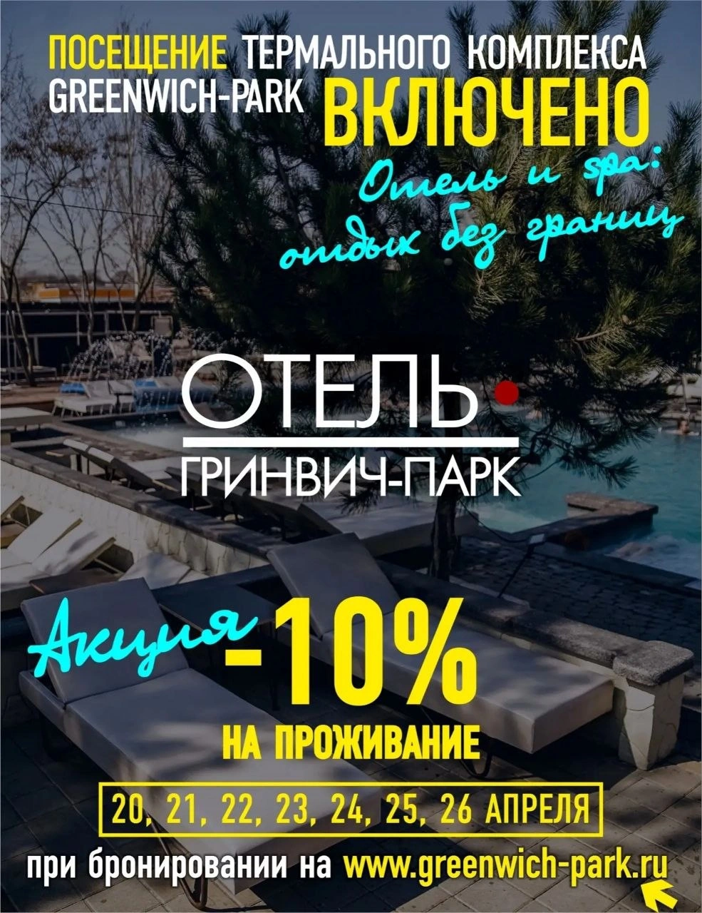 • -10% на проживание в основном отеле Гринвич Парк до конца апреля.