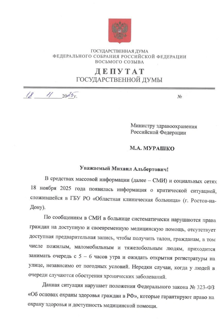 Пациенты стоят с 5 утра: депутат Госдумы требует проверить ситуацию в Ростовской ОКБ