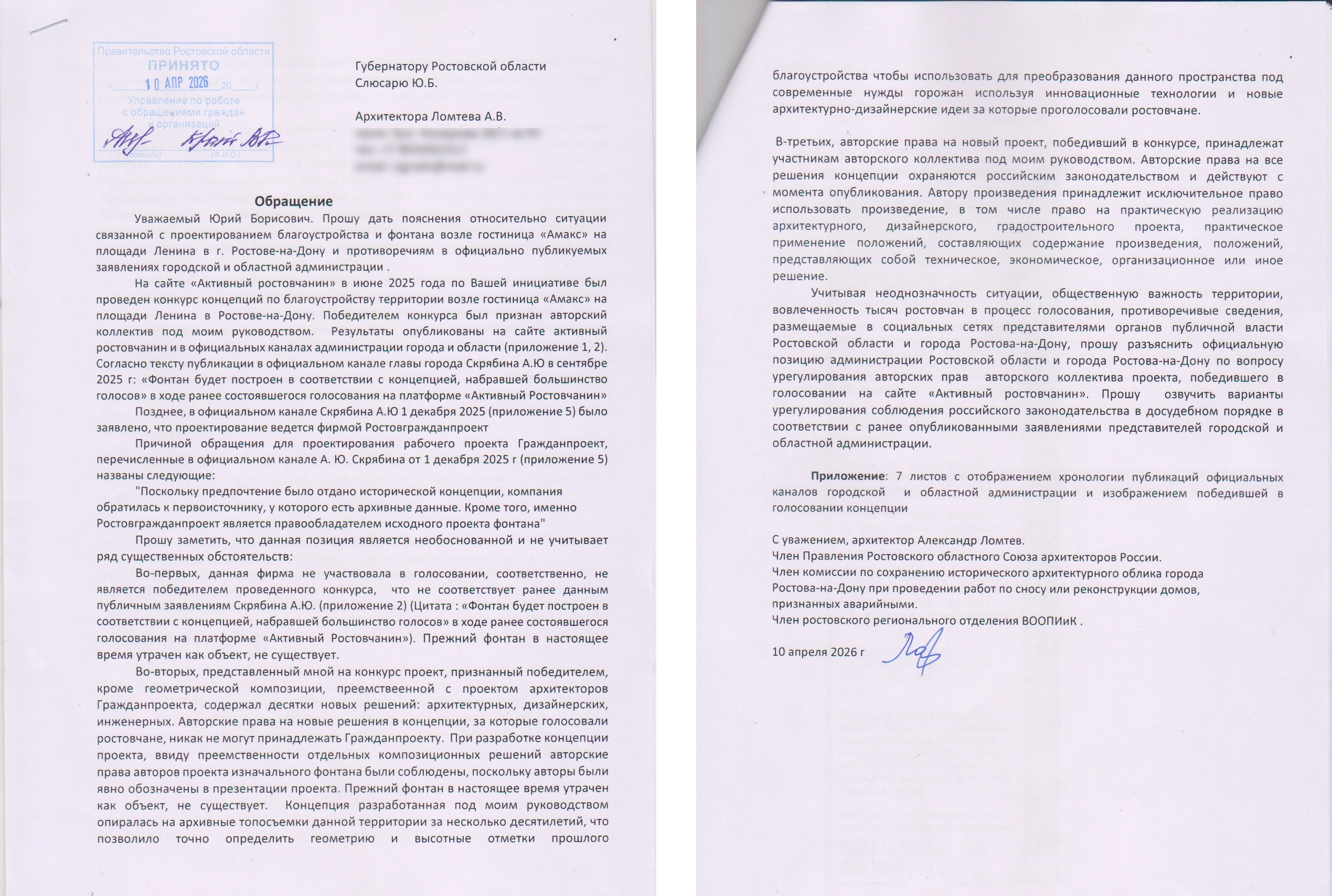 Архитектор направил запрос губернатору Ростовской области Юрию Слюсарю, чтобы прояснить ситуацию. Сейчас он заявил, что не несет никакой ответственности за то, что происходит с проектом.