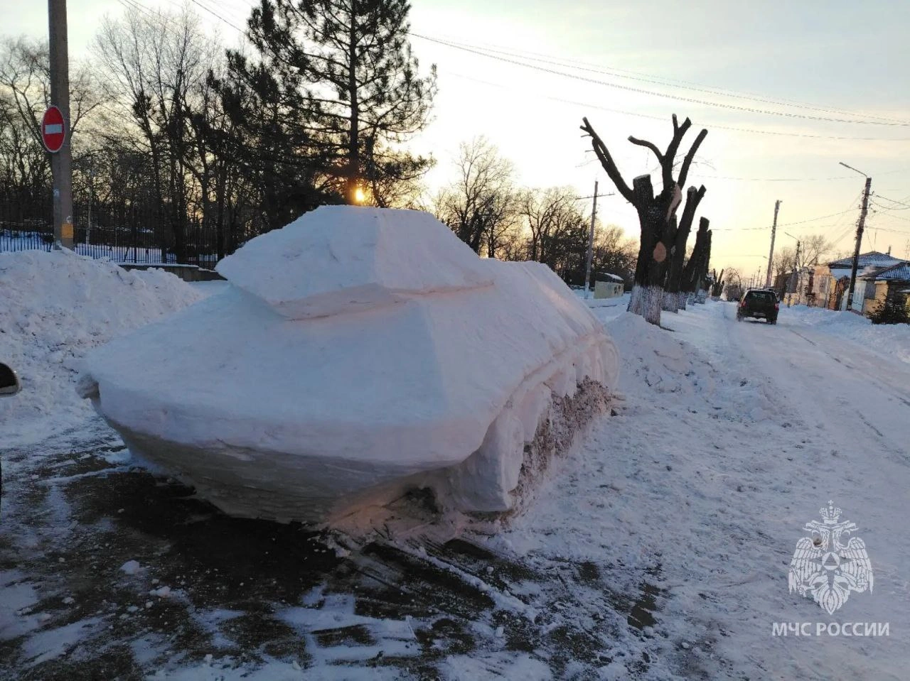 Пожарный из Новочеркасска создал снежный танк рядом со снежной лошадью