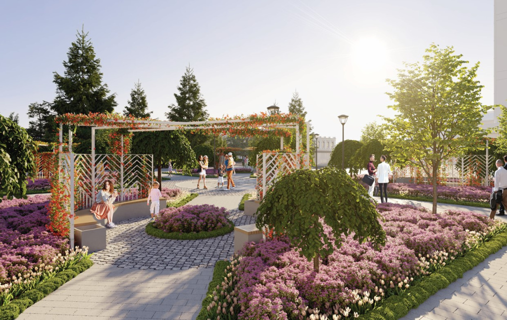В центре парка забьёт водный комплекс с фонтаном, а ещё здесь предусмотрели оздоровительную площадку где будут высажены ароматравы.