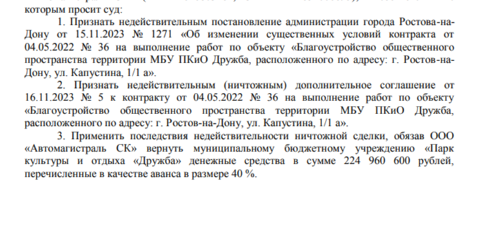 Почти 225 миллионов рублей требует прокуратура Ростовской области от подрядчика, который выполняет благоустроительные работы на объекте. Иск предъявлен также администрации Ростова и МБУ «Парк культуры и отдыха «Дружба». Информация об этом размещена на сайте Арбитражного суда Ростовской области.