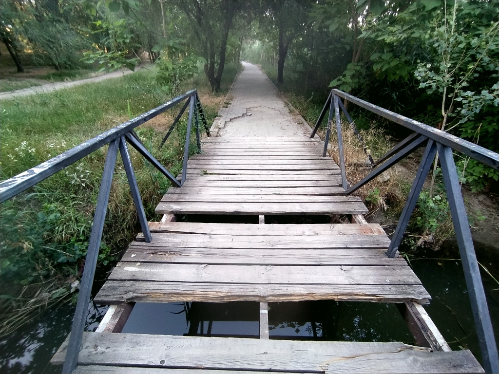 Чуть дальше ещё одно сооружение находится в не менее в плачевном состоянии. Идти по нему страшно не только потому что ближе к спуску отсутствует доска, но и из-за того, что он прогибается от каждого шага.