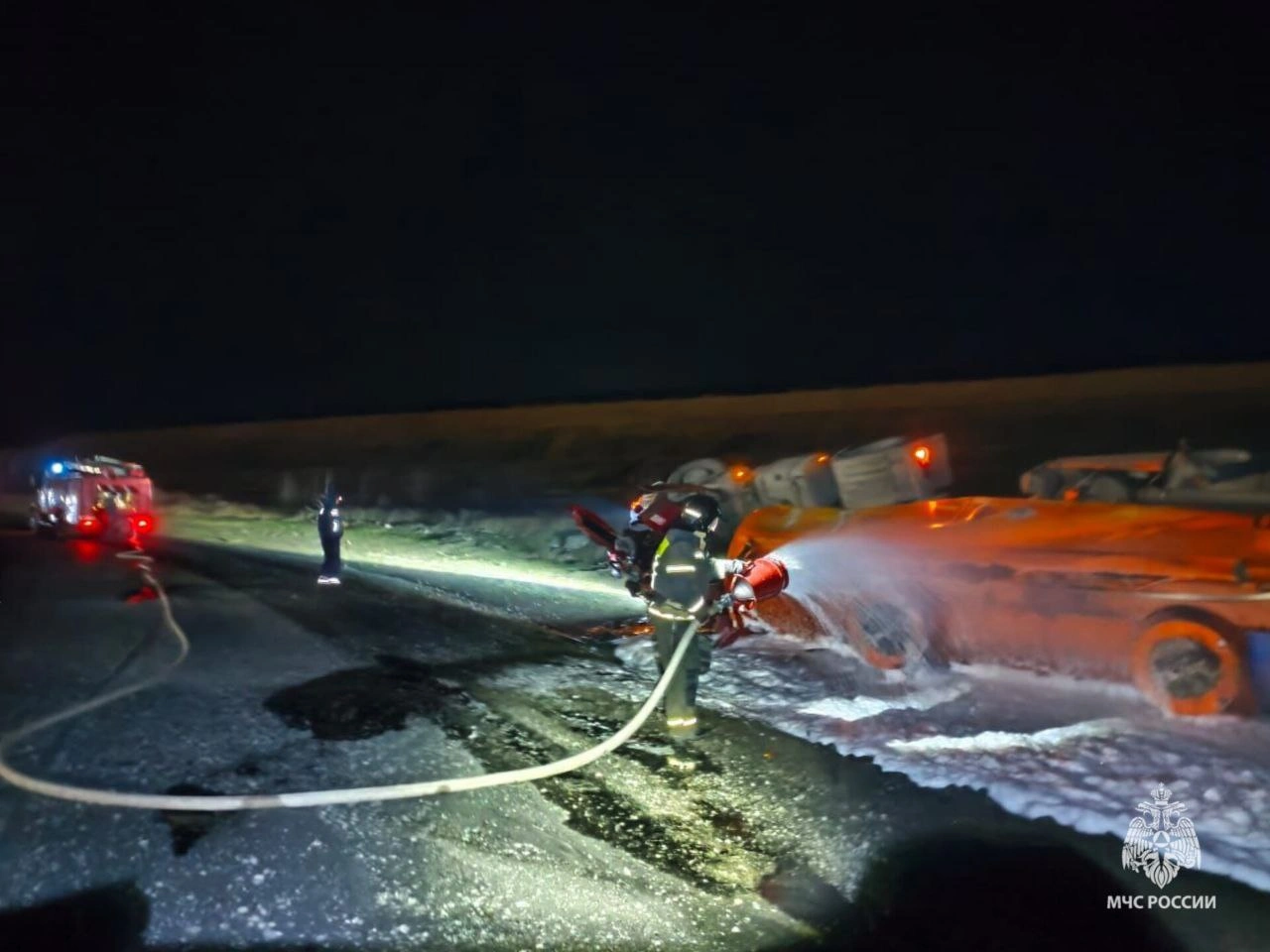 На место происшествия выехали расчеты МЧС. Возгорания удалось избежать, однако для предотвращения пожара специалисты провели проливку транспорта. В ликвидации последствий задействованы 19 человек и 10 единиц техники.