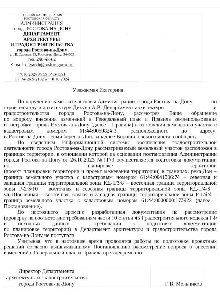 Жители также обратились в администрацию города с требованием внести изменения в Правила землепользования и застройки города Ростова-на-Дону и вернуть участок под рощей в зону рекреации. Однако в ответе за подписью директора департамента архитектуры и градостроительства Ростова Глеба Мельникова им сказали, что сначала нужно принять проект планировки.