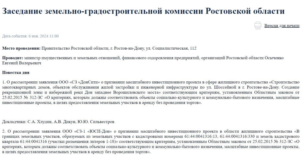А ещё 6 ноября должно было состояться заседание комиссии, на котором рассматривался вопрос о признании проекта ООО «ДонСити» по застройке рощи масштабным и передачи участка без торгов. Однако позже данная информация с сайта правительства неожиданно исчезла. Было ли совещание, и какое принято решение — неизвестно.