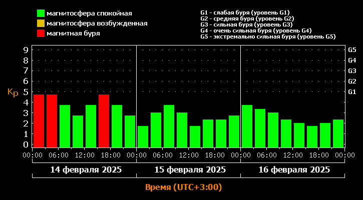 Слабые возмущения продлились всю ночь, с 00:00 до 6:00. Ещё одна волна пройдёт вечером, с 15:00 до 18:00. После этого они прекратятся. Кроме того, согласно прогнозу, магнитных бурь не будет и на выходных, 15 и 16 февраля.