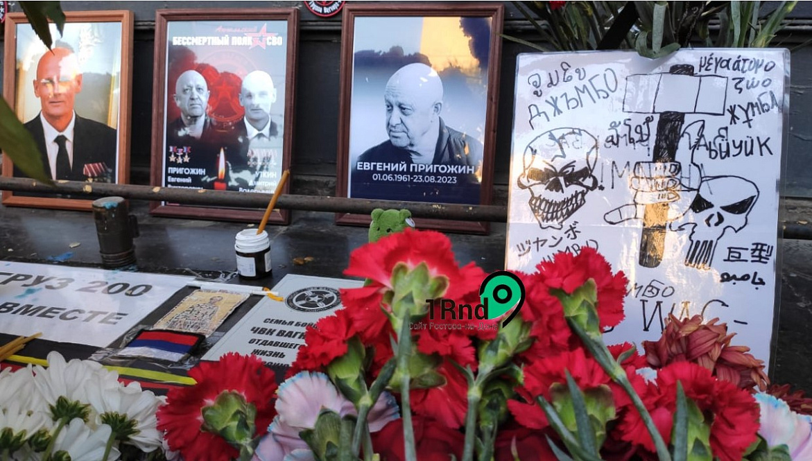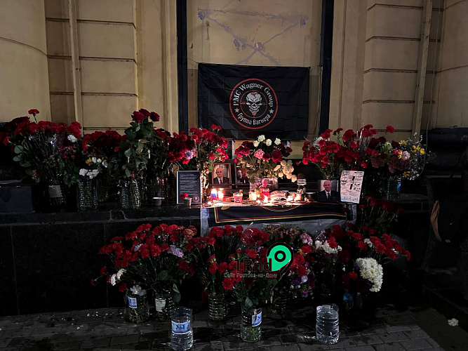 На выступе у ростовского цирка, ставшего уже народным мемориалом, фотографии Евгения Пригожина и Дмитрия Уткина, погибших ровно 40 дней назад в авиакатастрофе.