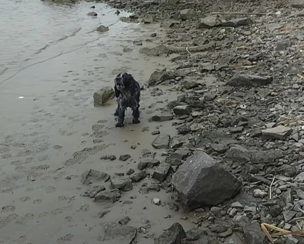 Услышав жалобный писк у реки, он обнаружил животных на опасном каменном выступе, который мог в любой момент скрыться под водой. На промёрзших камнях лежал беспомощный щенок, а рядом находилась его мать, собака породы спаниель, пытавшаяся его защитить.