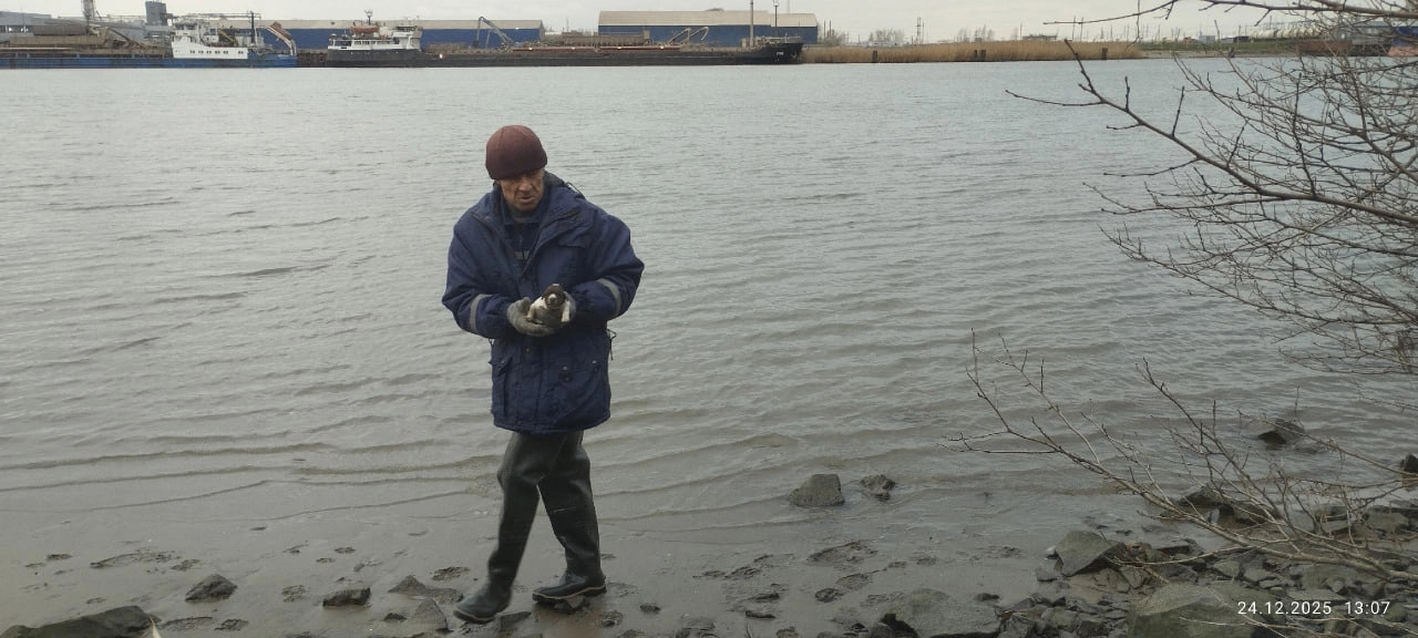 Спасатель в Ростове снял с ледяных камней слепого щенка и его мать