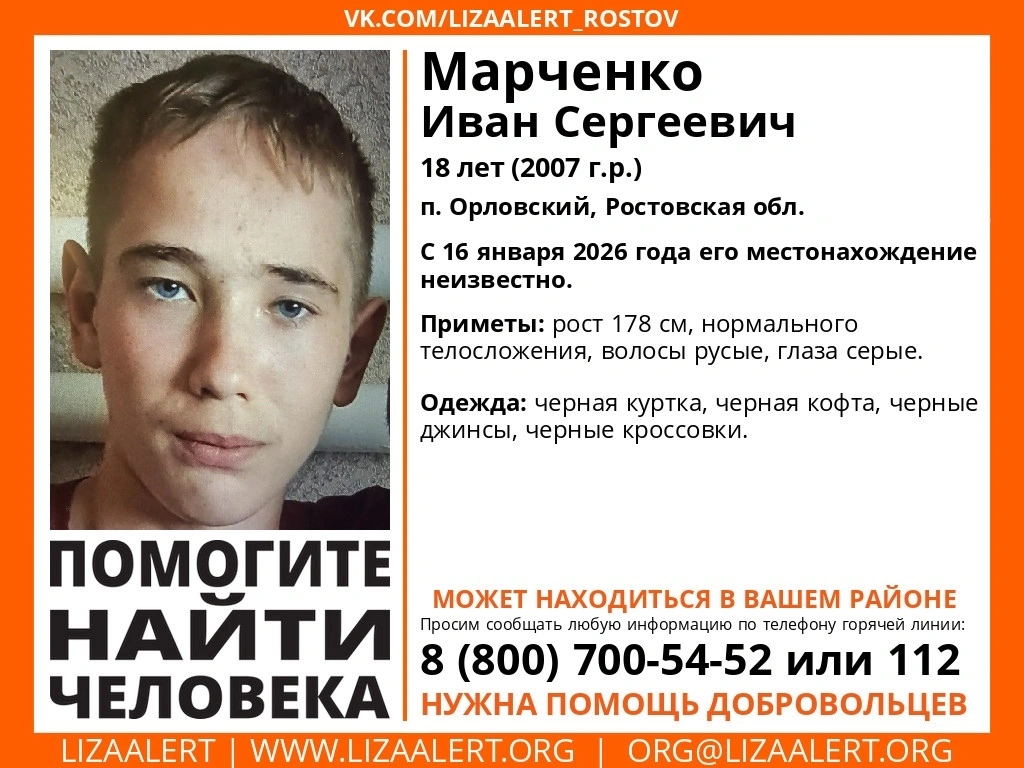 Всех, кто располагает информацией о местонахождении Ивана Марченко, просят сообщить по телефонам 112 или +7(800)700-54-52.