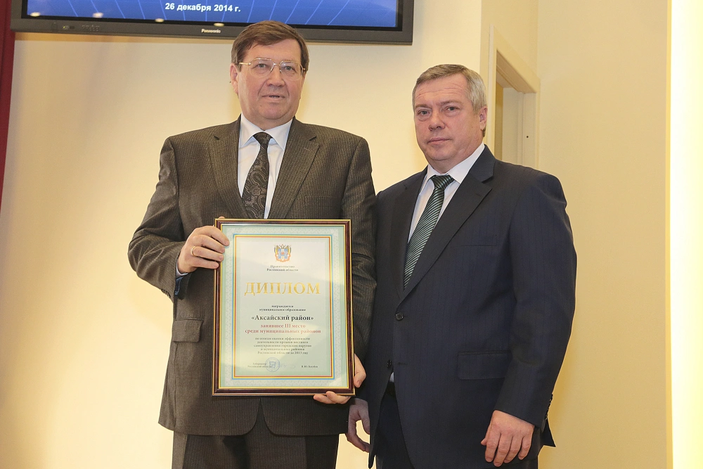 Василий Голубев вручает диплом за успешную работу Виталию Борзенко в 2014 году. Фото: правительство Ростовской области