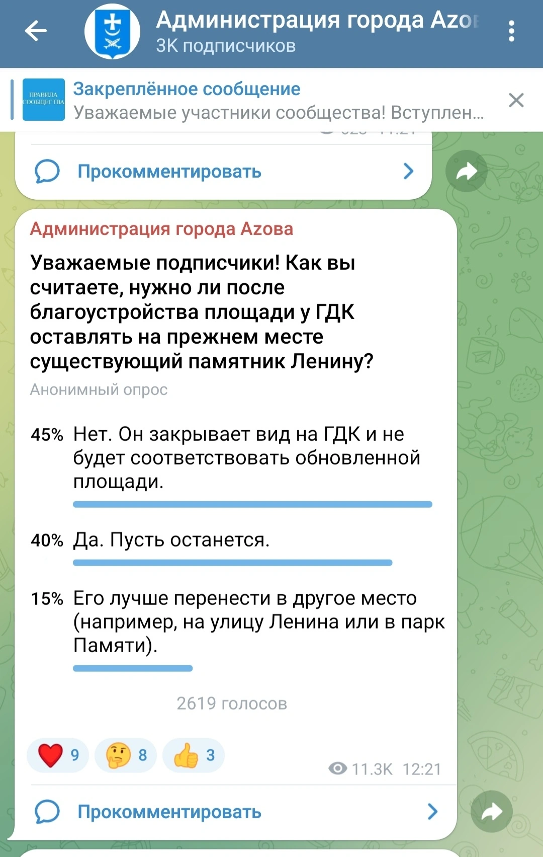 Буквально на следующий день администрация Азова запустила голосование в телеграм-канале. В нем приняли участие 2600 человек. Большинство выбрали вариант, что памятник Ленину нужно убрать с площади, так как он закрывает Дворец культуры и не будет соответствовать обновленной площади. О голосовании жителей оповестили и в других социальных сетях.