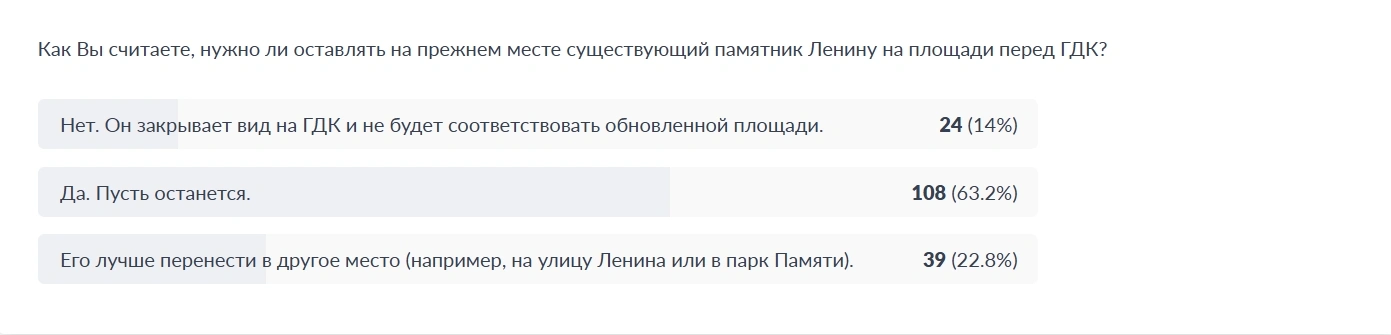 «В голосовании участвовали эскизные проекты благоустройства площади перед ГДК, после определения победителя была разработана проектно-сметная документация. Однако проектировщиками и заказчиками (предыдущими руководителями подразделений ЖКХ и архитекторами) был предусмотрен демонтаж памятника. В связи с чем принято решение организовать опрос».