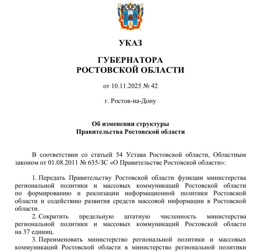 Как сказано в документе, функции министерства региональной политики и массовых коммуникаций перейдут к правительству. Штат министерства сократят на 37 человек. Этих сотрудников переведут в аппарат правительства. Министерство переименуют в министерство региональной политики Ростовской области.