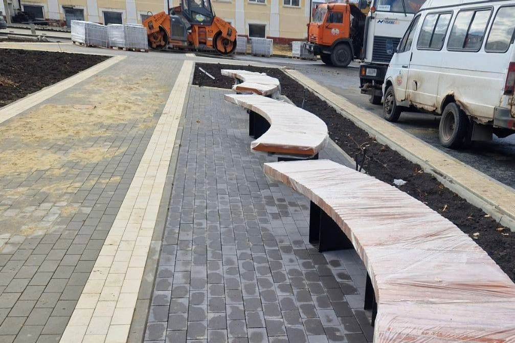 Площадь благоустройства — более 7 тысяч кв. м. Здесь появятся лавочки, урны, беседки с качелями, арт-объект в виде часов, детская площадка с музыкальными инструментами и новая система освещения. Озеленят территорию — посадят 56 деревьев, 305 кустарников и газоны. Сейчас ведутся работы по электроснабжению, водоснабжению, укладке плитки и подготовке основания под резиновое покрытие. Завершить всё планируют до конца года.
