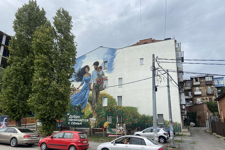 Работу выполнили молодые художники во время акции «Моя улица». Мурал посвятили Году семьи в России и Году добрых дел в Ростовской области.