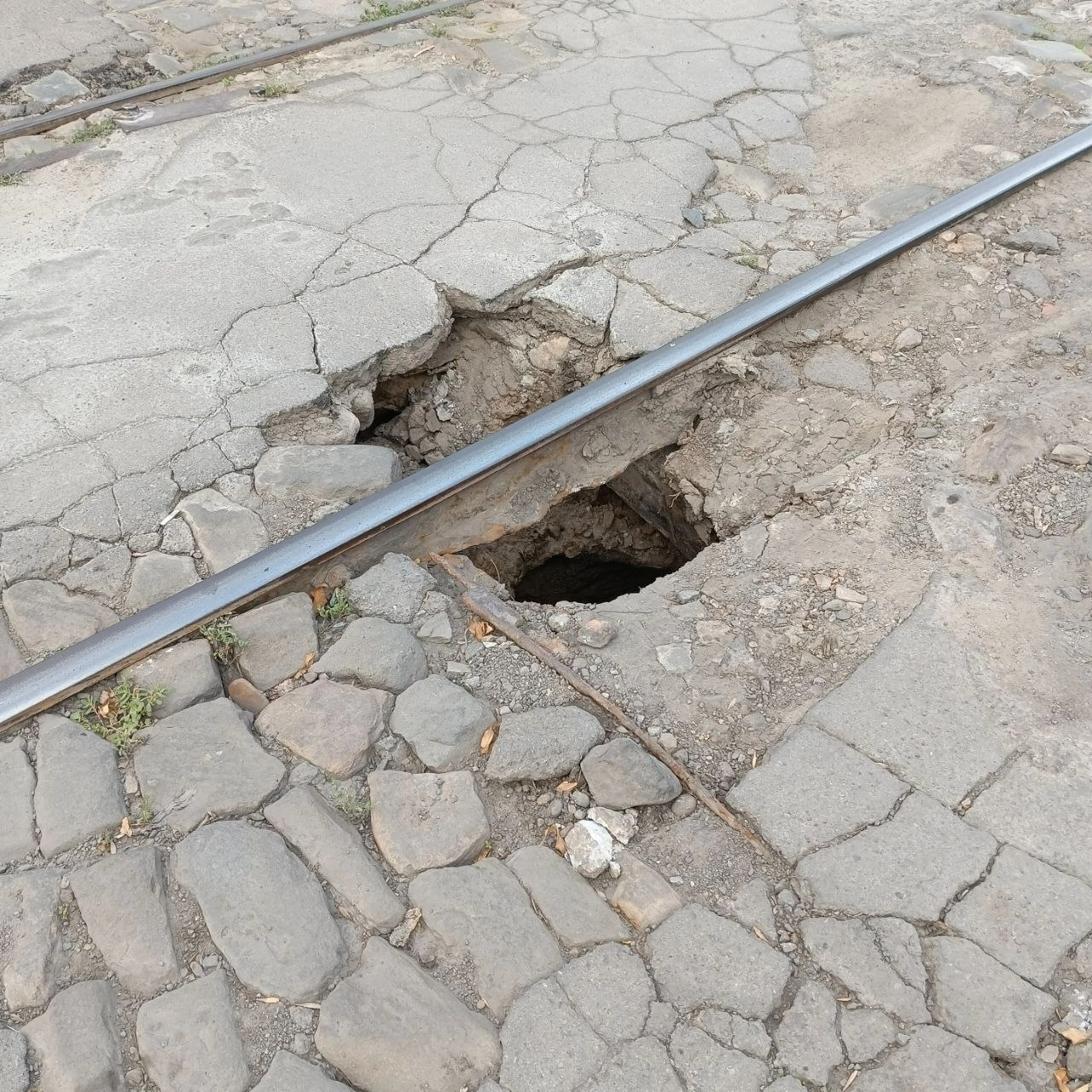 В Ростове на улице Собино провалилась дорога рядом с трамвайными путями